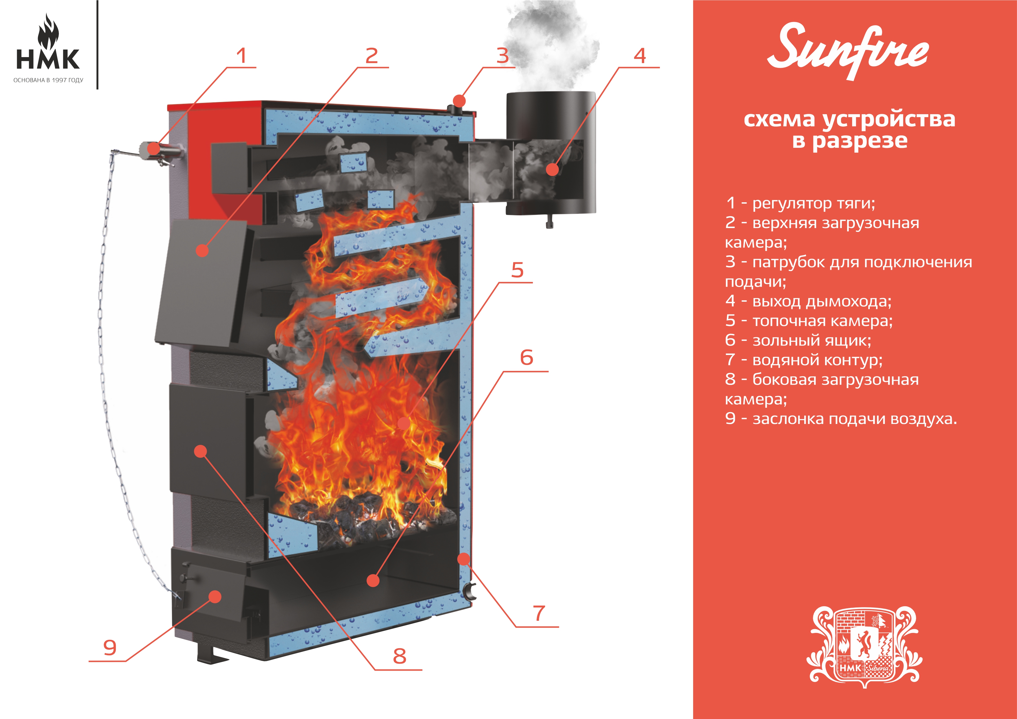 Конструкция котла "Sunfire" 60 кВт предусматривает использование угля и дров в качестве источников топлива. Корпус котла выполнен из стали с антикоррозионной обработкой.
